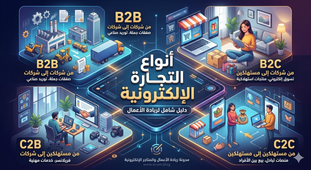 يمكن تصنيف التجارة الإلكترونية إلى ثلاثة أنواع رئيسية، وهي: التجارة بين المؤسسات (B2B)، التجارة بين الأعمال والعملاء (B2C)، وأخيراً التجارة بين العملاء (C2C).….
