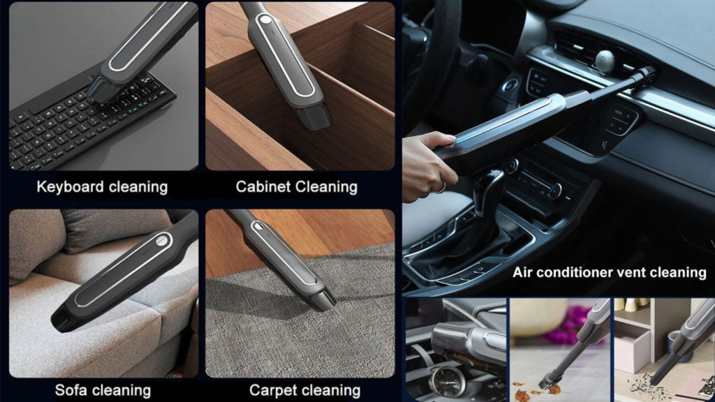 • في السيارة: الحل الأمثل لتنظيف المقاعد من فتات الطعام، وشفط الأتربة من الدواسات، وتخليص فتحات التكييف والزوايا الضيقة من الغبار المتراكم.